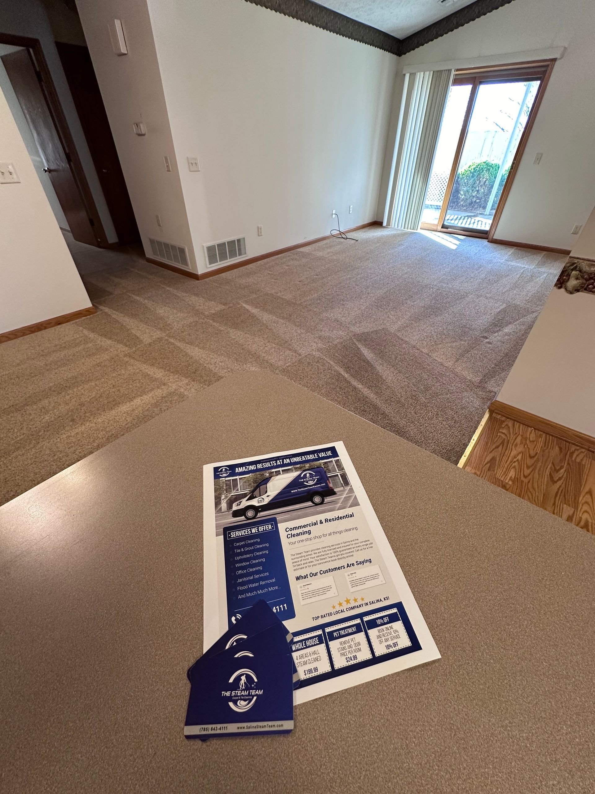 The Steam Team provides cleaning services in Salina and the surrounding areas. We are licensed and fully insured for your complete peace of mind. With over 13 years of experience, Your satisfaction is guaranteed on every single job. Some of our most popular services are carpet, upholstery and tile cleaning. We also offer office cleaning, janitorial cleaning, water restoration, pressure washing and junk removal! Check out the service tab for a full list of our services. You can book online or ask for a free phone estimates!